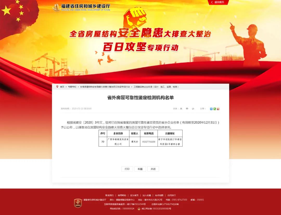 根據(jù)閩建安〔2020〕3號(hào)文,我司在福建省房屋結(jié)構(gòu)安全隱患大排查大整治百日攻堅(jiān)專項(xiàng)行動(dòng)中順利通過(guò)福建省住建廳的備案工作,現(xiàn)已取得福建省房屋可靠性鑒定資質(zhì)省外企業(yè)認(rèn)可